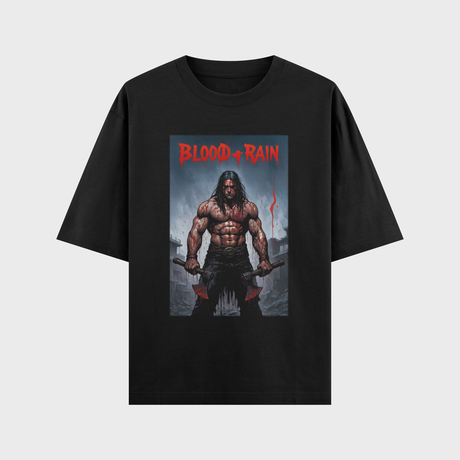 A fierce muscular warrior holding double axes beneath the bold “Blood + Rain” title.